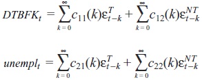εTt and εNTt are the technology and the non-technology shocks, respectively. If productivity (growth) is unaffected by non-technology shocks in the longrun, it must be that the cumulative effect of such shocks must be equal to zero. That is Σ∞k=0c12(k) = 0. Using this restriction we are able to identify the structural VAR and study the effects of technology and non-technology shocks on unemployment.