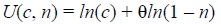 The household's instantaneous utility function over consumption, c, and leisure, l = 1 - n is: