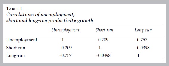 These trends can also be observed in table 1 which depicts the correlations between the unemployment rate and short and long-run productivity growth. While short-run productivity growth and unemployment are weakly positively correlated, long-run productivity growth is strongly negatively correlated with unemployment. One can also see that the two productivity series are virtually not correlated at all. This is important for section 4 where they are assumed to be independent of each other.