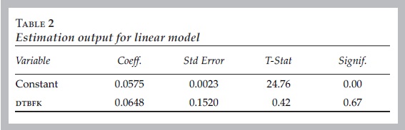 The positive coefficient before DTBFK is insignificant, implying that there is no linear relation between DTBFKt and unemplt.