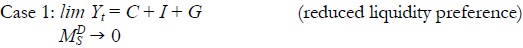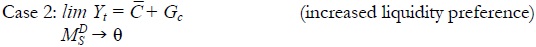 These cases represent, respectively, the ceiling and the floor for the output level of the economy. Case 2 shows that the greater part of money demanded is due to the speculative motive rather than to the transaction motive. As a consequence, output will be at the lowest level because the money demanded, according to the transaction motive, will be the minimum to still keep the economy working.