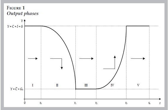 In the absence of any change in autonomous spending, the economy would leave phase II and it would enter phase III (depression case), which is a phase with full liquidity preference indicated by the case 2 limit. Since in economic depression an increase in autonomous investment due to high uncertainty is not expected, then phase IV will start only if the government makes an expansionist fiscal policy. This political decision (denoted by G) starts a process of recovery of the output that will increase continuously (at an increasing rate) until the limit indicated by case 1 is reached, causing the output to enter phase V The justification for this is that G is a component of aggregate demand, i.e., when G increases there is a tendency for the general price index to increase, thus causing in its turn an expectation that prices will increase reducing liquidity preference (an increase in the speculative parameter). In phase IV, the transaction motive for holding money would increase by the same amount that precautionary motive would decrease, implying a decrease in liquidity preference. Contrary to phase II, phase IV represents a spiral of inflation-employment. Phase V is equivalent to phase I and shows path of the output after phase IV is finished.