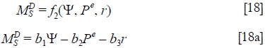 The model assumes that speculative motive for holding money is a function of price expectations (Pe), uncertainty (Ψ),7 and real interest rate (r). The justification for the relation between speculative demand for money and real interest rate is a result of the comparison between the effects of bonds' returns combined to the price expectations and the expected profitability of current investment decisions. This motive for holding money depends on agents' ability to form expectations regarding real and financial returns, which in turn implies that both are determined by future changes in prices. Therefore, the speculative demand will increase if the general price index is expected to fall implying a speculative behavior (part of consumption is postponed). In other words, if a fall in prices is expected, the coherent behavior is one of holding money because it allows profitable business in the future. It is important to highlight that there is no guarantee for good business for everyone in the future (there may be a lack of desired goods). Therefore, uncertainty is linked to future business as much as it is to future prices, thus,