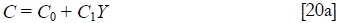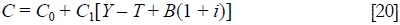 Aggregate consumption is explained by an autonomous parameter (the autonomous consumption, C0) and by the available income that is given by the difference between income (Y) and the sum of taxes (T), and the present value of public bonds, B(1 + i), thus: