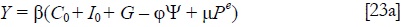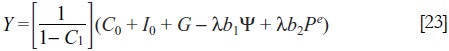 Although uncertainty (Ψ) is defined independently of Pe, both variables move in opposite directions: for instance, when Pe falls, the agents postpone their purchases, reducing aggregate demand. If aggregate demand gets lower and lower, future business becomes more uncertain, causing an increase in Ψ. Thus, both contribute to the decrease in the level of output. In fact, there is a link between the movements of these variables that could justify a functional dependence between them allowing the introduction of only one in the argument; thus, Ψ can be omitted in order to simplify equation [24] without damaging the analysis. In this manner, equation [24] may be written as,