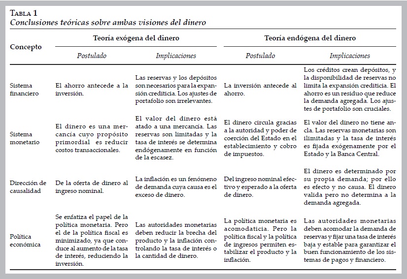 Por el contrario, la teoría endógena del dinero se ajusta a las realidades del mundo moderno. Las primeras contribuciones se remontan a Wicksell (1898), Bernacer (1922), Robertson (1955 [1922]), y Keynes (1930, 1936), y su desarrollo incluye los aportes de los teóricos contemporáneos, poskeynesianos y circuitistas, como Arestis (1992), Davidson (1972), Kaldor (1982), Lavoie (1992), Minsky (1957), Moore (1988), Nell (1998), Rochon (2001) y Wray (2004), entre otros.