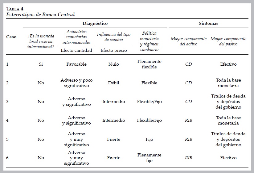 La tabla 4 resume todos los posibles estereotipos de Banca Central de acuerdo con su estructura de activos y pasivos (1, 2, ..., 6). El caso 1 es aquel de las economías emisoras de reservas, y todos los demás el de las receptoras. Claramente, la libertad que disfruta la Banca Central en la fijación de la tasa de interés disminuye en la medida en que se desciende en la lista.
