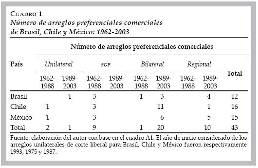 El cuadro 1 presenta el número de la mayoría de arreglos implementados por Brasil, Chile y México en el periodo 19622003. Este número no incluye los arreglos multilaterales. Los tres países han sido beneficiarios del SGP implementado por la Unión Europea (SGP1, en 1971), Japón (SGP2, en 1971) y Estados Unidos (SGP3, en 1976).
