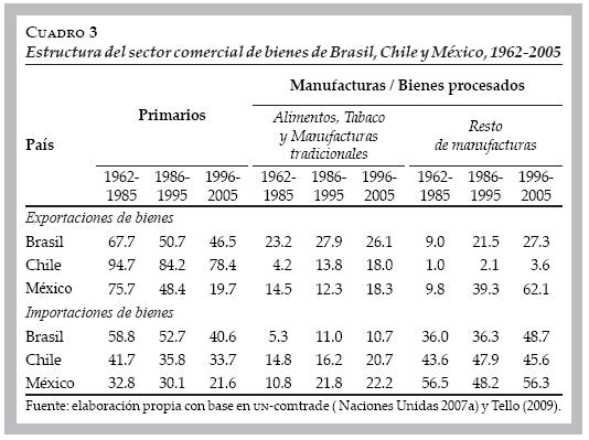 En 19622005, y para los tres países, entre 44 y 82 por ciento del valor importado son productos provenientes de Estados Unidos, Japón y los países desarrollados de Europa, y entre 36 y 57 por ciento de los productos importados eran de sectores manufactureros intensivos en el uso de capital humano y conocimientos. Cabe anotar que para estos tres países entre 22 y 59 por ciento del valor total importado era de productos del sector primario. La estructura y dirección del sector comercial en estos tres países sugieren que las fuentes de dicho comercio son consistentes con la explotación de las ventajas competitivas y comparativas para Brasil y México. En Chile las fuentes parecen estar dominadas por la explotación de las ventajas comparativas.9