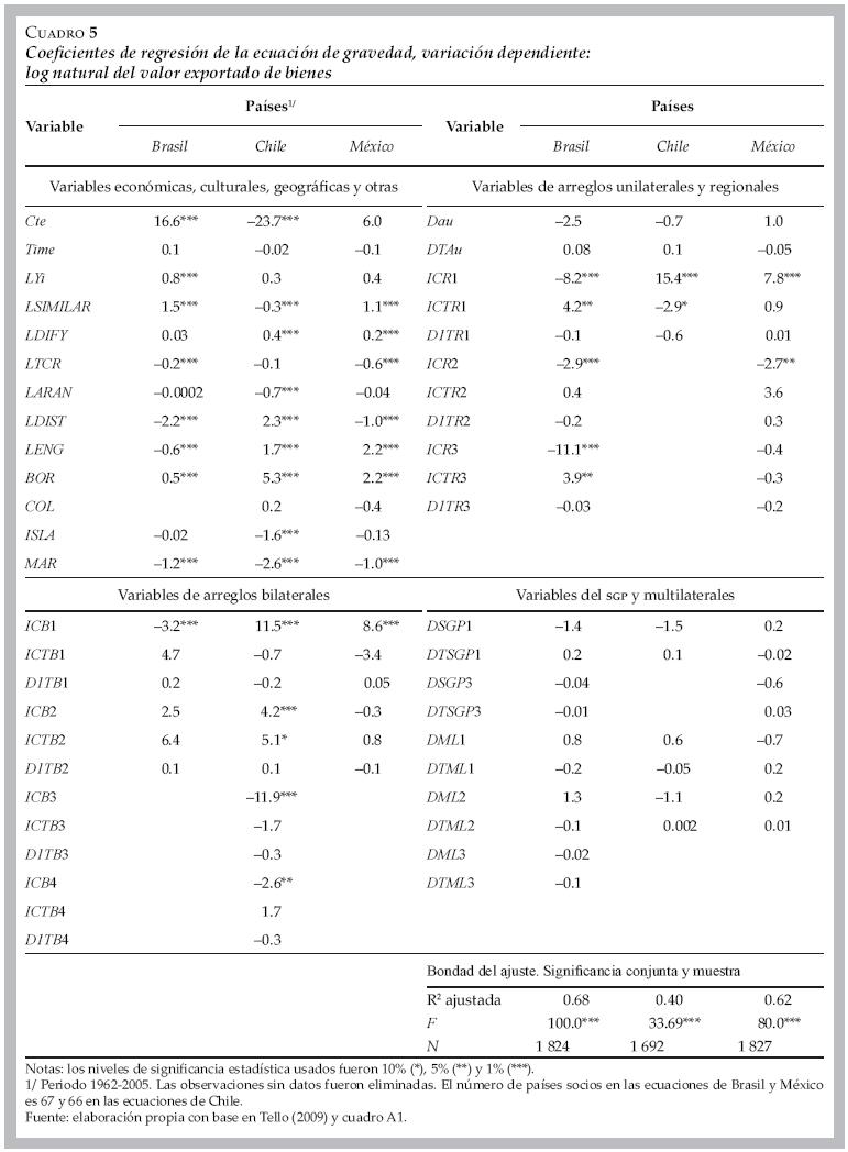 Estos resultados son consistentes con el análisis de varianza realizado (no reportado). Estas diferencias en la significancia estadística de los coeficientes entre los tres grupos de variables también muestran que los flujos comerciales bienes en el periodo 19622005 están determinados fundamentalmente por las variables económicas y las características de los países que comercian y que la incidencia de los arreglos establecidos por los tres países en dicho periodo es marginal.