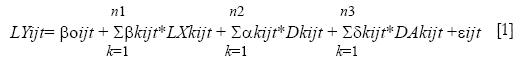 Las variables DAit y DTAit representan los arreglos A no regionales en los cuales el país i se beneficia. Estos arreglos pueden ser unilaterales, del sistema generalizado de preferencias o de los multilaterales. La variable DAit es binaria y toma el valor unitario para el país i beneficiario del arreglo A durante la implementación del arreglo y cero en caso contrario. La variable DTAit es definida como DAit*T (donde T son números enteros del 1 al 44, asociados a los años del periodo de la muestra). El coeficiente de DAit mide el efecto sobre el nivel del volumen comercial del arreglo A, mientras que DTAit mide el efecto sobre la tendencia del volumen comercial del mismo arreglo.