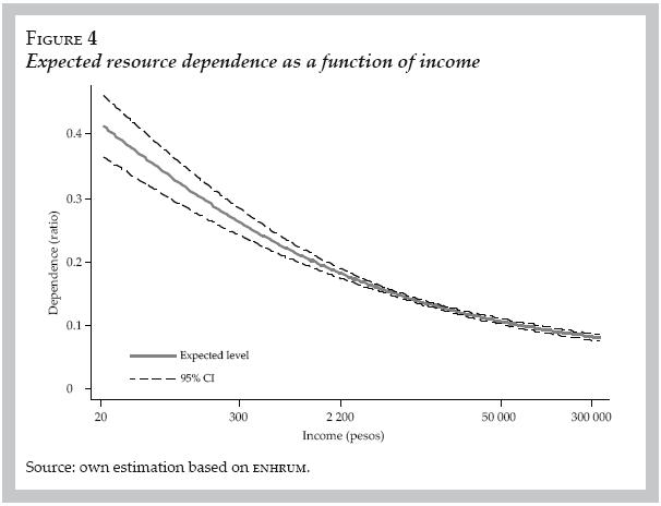 We follow a similar approach as a first step to estimate the relationship between natural resource dependence and income. Using the results of a tobit regression with the natural logarithm of income as the only explanatory variable, we construct the expected dependency ratio for the households that participated in extraction.6 Figure 4 shows that resource dependency decreases with income, from close to 40% of income for the poorest households to less than 10% for the richest ones.