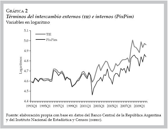 La gráfica 2 muestra que los términos del intercambio internos entre los productos exportables y los importables (PixPim) resultan inferiores a los términos del intercambio externos (TIE), particularmente en la última década.5 La diferencia entre ambos representa el efecto de las políticas comerciales aplicadas a estos productos, tales como los impuestos a las exportaciones, las tarifas a las importaciones y las restricciones cuantitativas a ambos aspectos del comercio exterior. Los términos del intercambio internos estarían captando los movimientos de los precios externos, del tipo de cambio y de la política comercial externa. Estos impuestos aduaneros (derechos de exportación y tarifas a las importaciones) son recaudados exclusivamente por el gobierno nacional y no se coparticipan con los estados provinciales.
