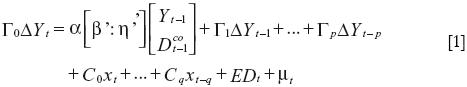 donde Yt = (Y1t,...,Ykt)' es un vector de K variables endógenas observables, xt = (x1t,...,xMt)' es un vector de M variables exógenas observables, Dtco contiene los términos determinísticos incluidos en las relaciones de cointegración y Dt contiene todas las restantes variables determinísticas. El vector de residuos μt (de dimensión k) presenta media cero, un proceso de ruido blanco y una matriz de covarianzas definida positiva, E(μt, μt') = Σμ. Los parámetrosmatrices α y β tienen dimensión K × r y presentan un rango r. Ellos especifican la parte de largo plazo del modelo con β considerando las relaciones de cointegración y α representado la velocidad de ajuste. Por su parte, Γi, Cj y E son parámetrosmatrices (η corresponde a Dtco).