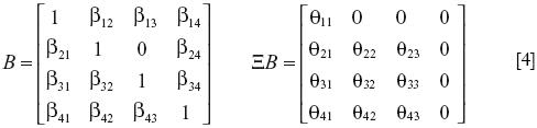Finalmente, los choques monetarios no afectarían al tipo de cambio real multilateral en el largo plazo θ34(L) = 0 (debe incluirse debido a la necesidad de imponer ceros en la última columna de la matriz de largo plazo, lo mismo que θ44(L) = 0). Estas restricciones se aplican a la matriz ΞB de efectos de largo plazo, mientras que la restricción β23=0 (que los choques de demanda no influyen en el producto en el corto plazo) se considera contemporánea y se aplica a la matriz B.14 En la expresión [6], se señalan las restricciones aplicadas a las matrices B y ΞB: