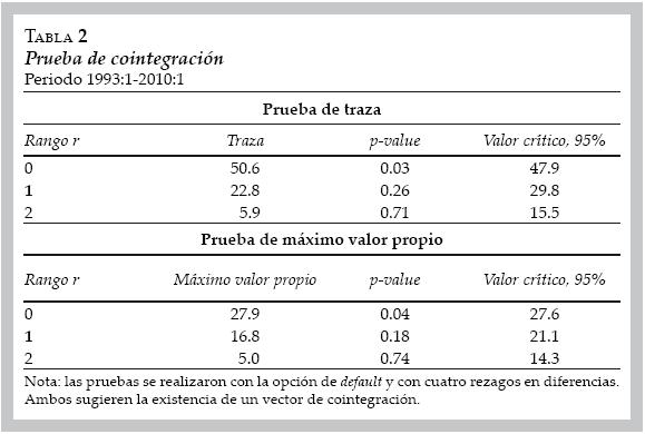 En la tabla 2 se presentan los resultados de las pruebas de cointegración (traza y máximo valor propio) para el modelo que incluye a los términos del intercambio internos, al PIB agropecuario real, al tipo de cambio real multilateral y a las tasas reales de interés. Ambas pruebas muestran la existencia de un vector de cointegración entre las variables. Estas pruebas son válidas sólo cuando se incluyen variables que no son estacionarias en niveles y que presentan el mismo orden de integración.
