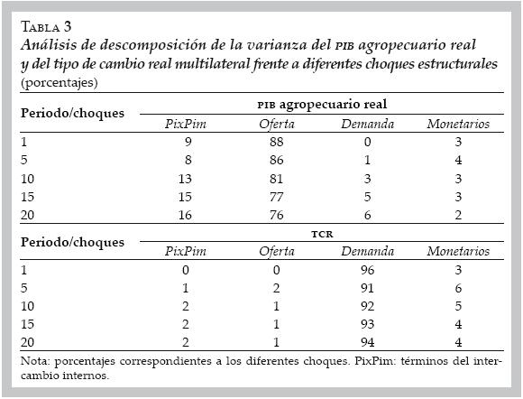 Mientras las funciones de impulsorespuesta miden el comportamiento dinámico de las variables a partir de un choque estructural, el análisis de descomposición de la varianza permite distribuir la varianza del error de predicción de cada variable en función de sus propios choques y de las innovaciones en las restantes variables del sistema. En otros términos, este análisis considera la importancia relativa de cada innovación aleatoria en las fluctuaciones de las variables, de forma que la suma de estos porcentajes alcance a cien (véase la tabla 3). Los choques de oferta (productividad) explican 76% de la variabilidad del producto agropecuario real en el largo plazo, mientras que los choques en los términos del intercambio internos representan 16% en dicho lapso. Por su parte, los choques de demanda (tipo de cambio real multilateral) y los monetarios explicarían alrededor de 6 y 2 por ciento, respectivamente. De esta forma, los choques en los términos del intercambio resultan ser más importantes que los monetarios para explicar la variabilidad del producto en el largo plazo.17