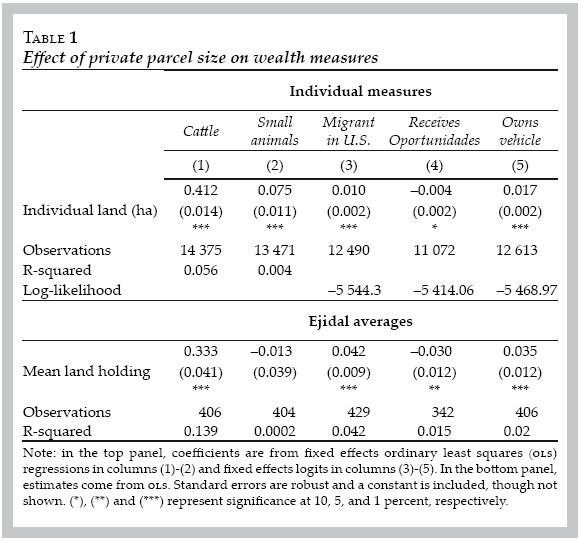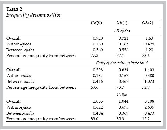 The data shows that the allocation of private land undertaken at the time of the Agrarian Reform within and between the jidos is highly correlated with other wealth measures, including presence of a vehicle, receipt of government antipoverty subsidies, cattle holdings, and migration to the United States (U.S.). Decomposition of land inequality reveals that this inequality is much higher between ejidos than within them, and that the opposite is true of cattle inequality, although the measures of between ejido cattle inequality are very similar to those of land. Precolonial populations, the date of ejido founding, and geographic characteristics are have important impacts on the distribution of land within and between ejidos. Specifically, more dense precolonial populations are positively correlated with lower allocations of land from the Agrarian Reform, and with smaller cattle herds. They are also negatively correlated with land inequality within the ejidos probably because many of the ejidos in these regions are entirely managed as common property. On the contrary, presence in a Mayan region is positively correlated with inequality in current assets as measured by cattle. One possible explanation of this phenomenon is that this distribution is simply a reflection of a traditionally hierarchical society. The data also shows that ejidos formed early on in the Reform tend to have been allocated less land, although early formation does not appear to have affected the betweenejido distribution of cattle. Earlyformed ejidos, on the other hand, tend to have highly unequal cattle distributions within their boundaries. Finally, geographic variables exhibit a strong influence on both within and between ejidal inequality, in the past and the present. Higher variation in quality tends to lead to great variation in withinejido distributions, and between ejidal inequality is strongly driven by the presence of temperate forests a proxy for higher quality soils.