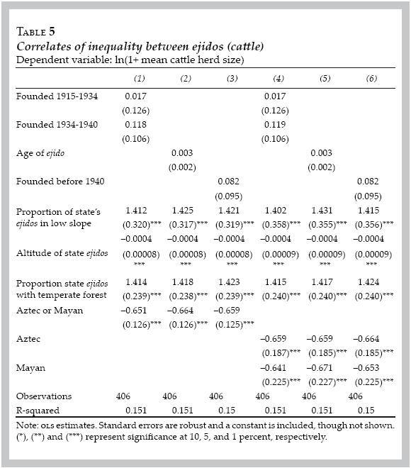 Cattle herd sizes proxy for the current distribution of wealth. Given the variation in productivity of cattle across Mexico, this proxy is imperfect. However, cattle tend to be an important asset throughout the country and are present in all of the zones contained in the sample. Consistent with the variation of cattle productivity across space is that geographical variables are important determinants of both within and between ejido inequality. The timing of the Agrarian Reform does not have any effect on the distribution of cattle between ejidos, but ejidos formed before the 1934 revisions of the provisions for the Reform tend to have higher withinejido inequality. Finally, ejidos located within the cores of the Aztec or Mayan empires have significantly smaller cattle herds, and those located within the Mayan zone have significantly greater inequality within these herds.