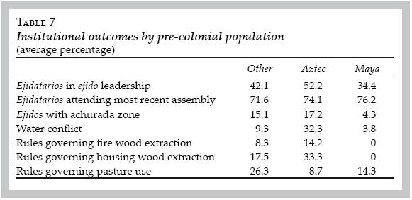 Although the data do not permit the establishment of causality, it does allow for the examination of differences in institutional outcomes across precolonial populations and year of ejido formation. It shows political concentration and absence of rules regulating commons use in the Mayan region, and instability of property rights in the Aztec region, relative to those ejidos found outside of these regions. Nonetheless, the correlations are suggestive of the deterministic nature of institutions and geography together shaping the distribution of both past and present wealth.