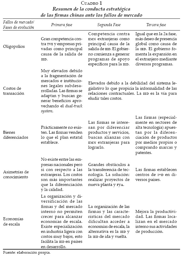 En síntesis, de acuerdo con los argumentos presentados puede concluirse que durante la primera fase de evolución de las EMN chinas la estructura oligopólica de la industria no originó economías de escala ni ahorro de costos de transacción ni generación de ventajas particulares de la firma como lo predicen las teorías convencionales debido principalmente a la intervención del gobierno (véase el cuadro 1).