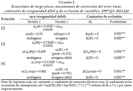 Esta primera percepción sobre la relación entre las expectativas y las variables macro fue confirmada a partir del análisis de cointegración (de acuerdo al procedimiento propuesto por Johansen, 1989; 1995). Se especificaron tres vectores: [Δ4pib, IE], [Δ4fbkf, IE], [Δ4TEMP, IE], a los que se aplicó dicho contraste. Los resultados mostraron que en todos los casos existía una relación de cointegración entre las variables involucradas. Los resultados de los contrastes se muestran en el anexo. Las ecuaciones estimadas fueron las siguientes:
