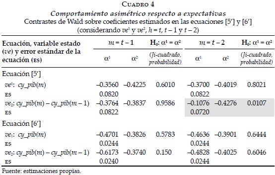 Adicionalmente, se pone a prueba la hipótesis de asimetría en la respuesta a expectativas ante contextos más y menos favorables de la actividad económica global. Esta hipótesis se fundamenta en resultados de estudios previos que dan cuenta de los disímiles comportamientos de los individuos ante las buenas y malas noticias (Bowman, Minehart y Rabin, 1999; Soroka, 2006).