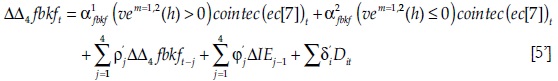 9 Los coeficientes significativos rezagados fueron ρ1 y ρ4 y φ1 en la ecuación [5]. En la ecuación [6] sólo resultó significativo τ4. Se consideraron iguales retardos en las especificaciones de ambas ecuaciones.