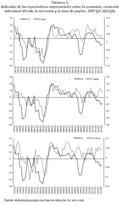 El estudio se apoya en el análisis agregado de las series temporales de las variables de interés. Considera la información de expectativas empresariales de la Encuesta Mensual Industrial de la Cámara de Industrias del Uruguay (CIU), estimaciones de las Cuentas Nacionales del Banco Central del Uruguay (BCU) y del Instituto Nacional de Estadística (INE), entre el tercer trimestre de 1997 y el último de 2012 (1997:Q3-2012:Q4). La exploración empírica se sustenta en el empleo de herramientas econométricas de series temporales, correlaciones cruzadas, análisis de cointegración, modelos de vectores autorregresivos con mecanismo de corrección del error con ajuste lineal y no lineal, y análisis de causalidad.