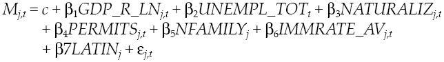 Given that the dependent variable, M j,t , is the annual rate of emigration from Spain in the period 2008-2012 by country j of birth of the immigrants24, the general specification given by equation [2] is as follows: