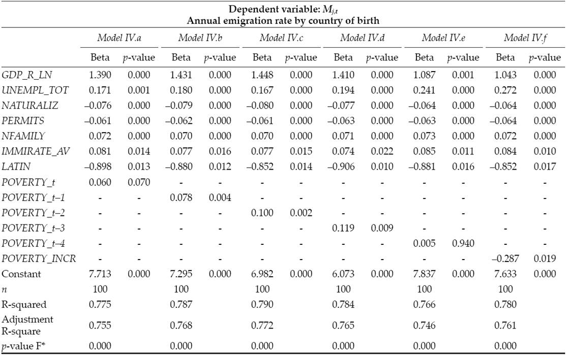 The possible existence of an immigration trap is shown, precisely, when this last result is interpreted taking into account the recent unstoppable growth of the poverty rates among the foreigners. As can be seen in Figure 5, it is difficult to understand why the high rates of poverty in 2011, 2012 or 2013 do not lead to emigration but, according to our model, this would be more influenced by what happened to poverty in 2008, 2009 or 2010, years with substantially lower levels. One explanation is that immigrants do not re-migrate more because they cannot, as they live in poverty and, therefore, are trapped in Spain. Finally, this existence of the poverty trap is also confirmed by the negative relationship found between the emigration rate and the growing poverty rate (see Model IV.f in the Annex).