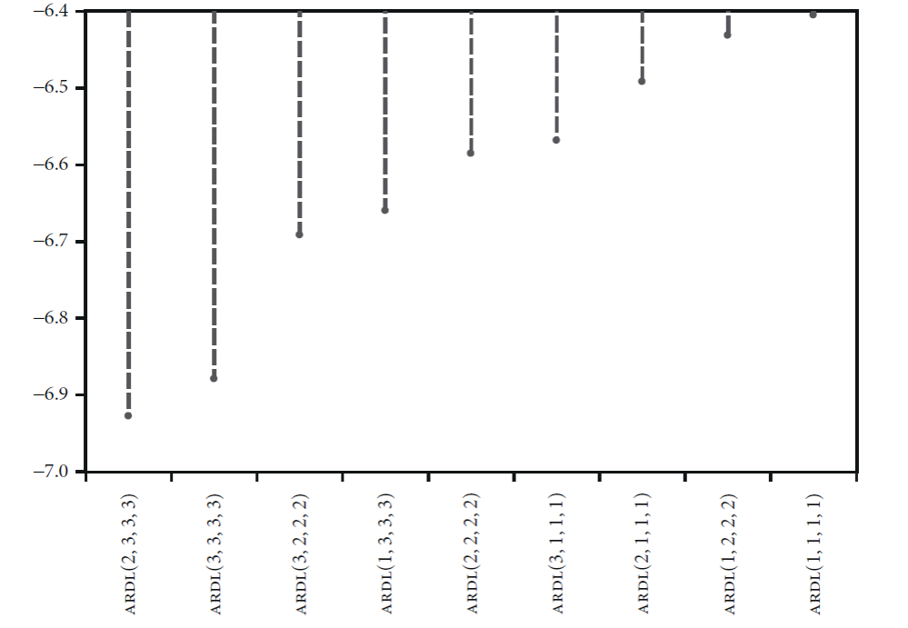 Gráfica 1 Selección de los retardos óptimos para la especificación del modelo ARDL en conformidad con el criterio de información de Akaike