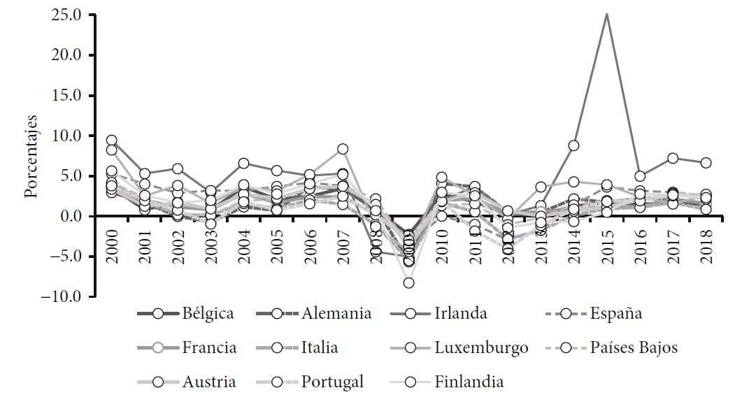 Gráfica 2 Tasas de crecimiento anuales del PIB real en la eurozona, 2000-2018