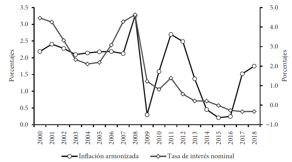 Gráfica 3 Inflación armonizada de la eurozona* (eje de la izquierda) y tasa de interés nominal de corto plazo del BCE (eje de la derecha), 2000-2018