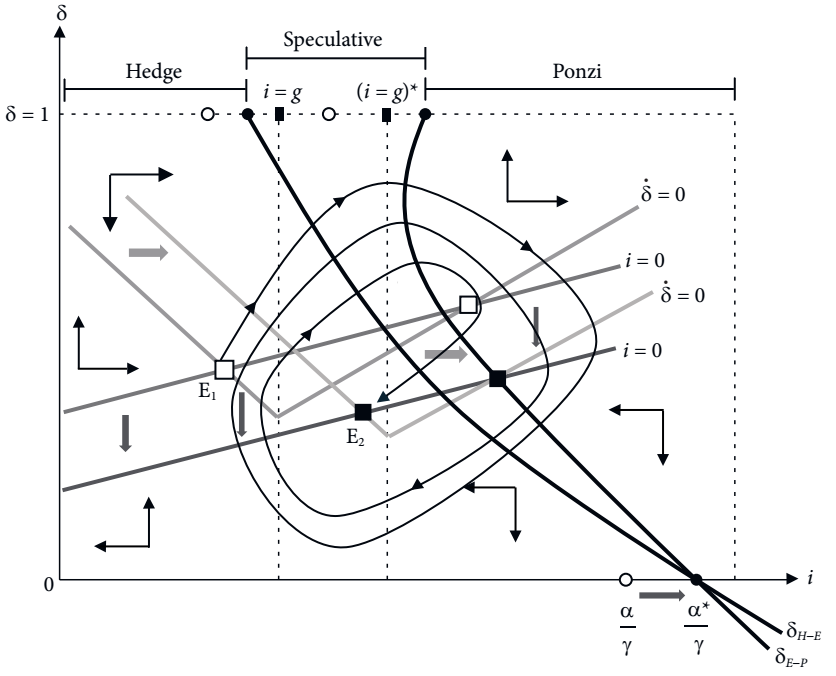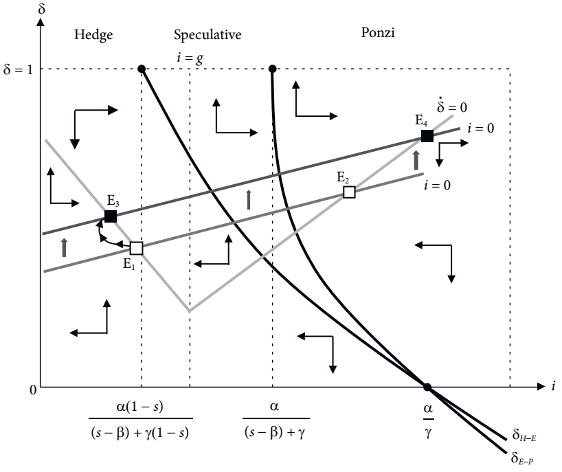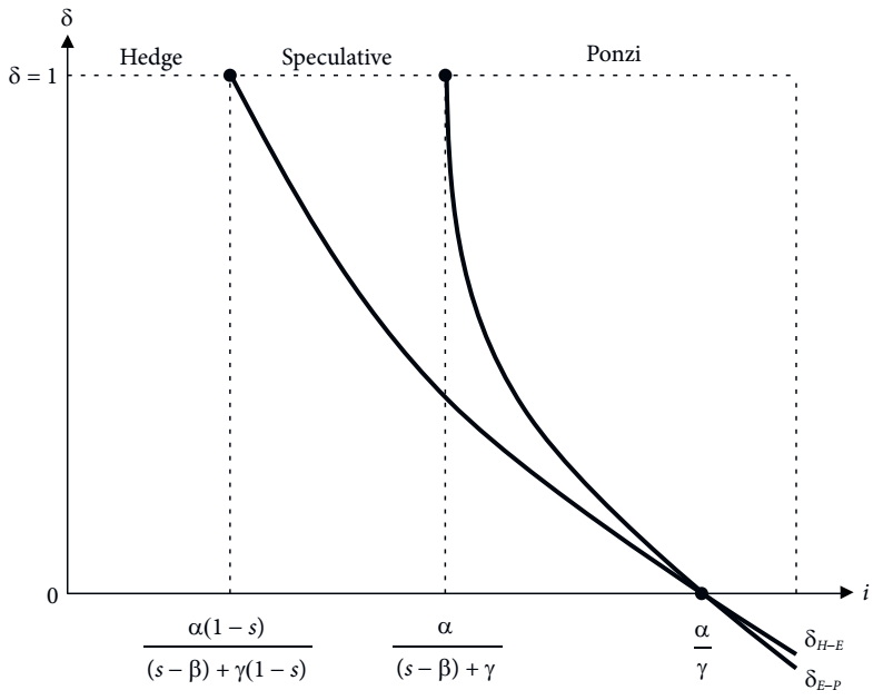 From the two equations above, it is easy to verify that the curve δH-E touches the limit value δ = 1 to the left of this value for the curve δE-P . Thus, as shown in Figure 1 below, the economically relevant region in plan (δ,i) can be divided into three subregions, each of which characterizes a Minskian stance of financial fragility.