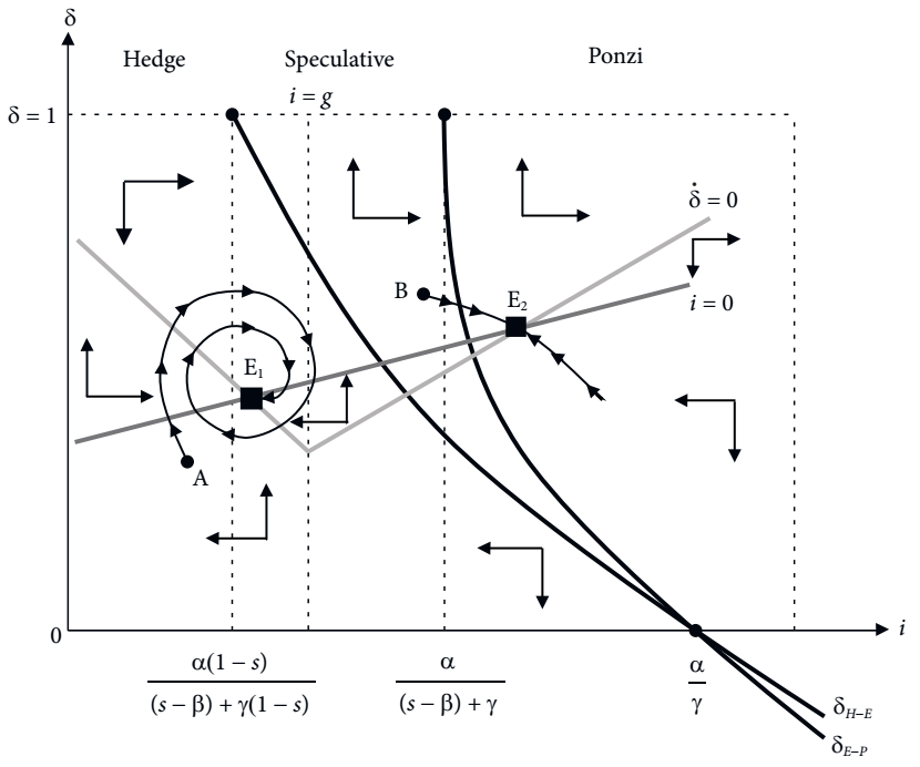 Therefore, Figure 2 below illustrates a situation in which there is a stable equilibrium characterized by damped spirals at point E1 and a saddle trajectory-type equilibrium at attractor E2. In effect, the Hedge region is stable, and the Ponzi region is highly unstable. For example, if the trajectory leaves the starting point, A, there will be a damped dynamic around the equilibrium point, E1. However, if the starting point is in the Ponzi region, such as point B, the dynamics will be that of a saddle trajectory. It is also worth noting that the saddle trajectory separates the stable zone of the system from its unstable zone.