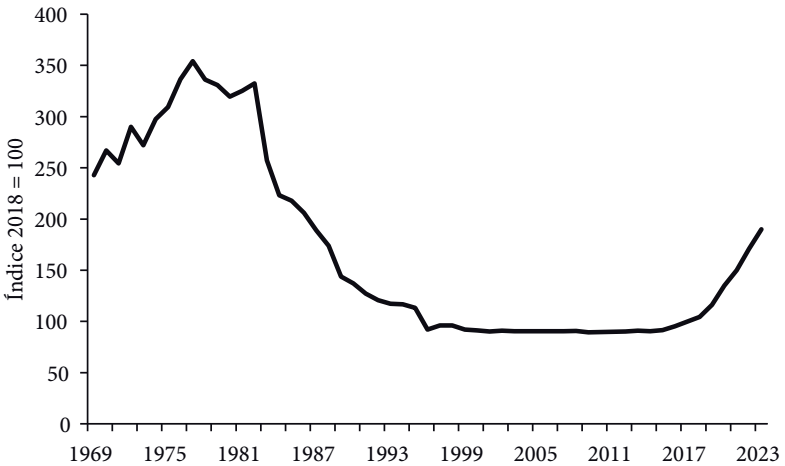 En la Gráfica 1 se observa la evolución histórica del SM en términos reales. El valor máximo histórico del SM ocurre en 1977, posteriormente empieza su caída. A partir de 1982 empieza a aumentar la velocidad de la reducción y esta se detiene en 1996. Después, se puede notar que el SM se mantuvo constante porque las modificaciones que se le hacían sólo eran para conservar estable su poder adquisitivo. Se pensaba en la literatura neoclásica tradicional que, si se incrementaba el SM, aumentaría la inflación o el desempleo. Es hasta 2018 cuando los incrementos al SM rompen con su estancamiento.