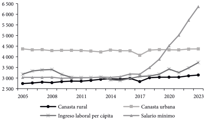 Nota: el salario mínimo proviene de CONASAMI (2024b). Las canastas rural y urbana por persona representan el valor monetario de la línea de pobreza por ingresos del mes de enero de cada año, esta información se obtiene de CONEVAL (2024) e incluye la canasta alimentaria y no alimentaria. Precios de septiembre 2023. Las medidas son mensuales.