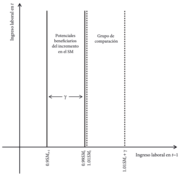 Sea el panel t aquel que permite estimar el impacto del aumento en el SM vigente a partir del año t.1 Por ley, los trabajadores no deben percibir salarios menores al SM. Por ello, en el panel t los potenciales beneficiarios del incremento del SM son aquellos que reciben entre el SM vigente en t-1 (SM t-1 ) y el SM en t (SM t ). Hay que considerar que en la muestra de los potenciales beneficiarios hay trabajadores que reciben salarios menores al SM establecido por ley. Por eso, se proponen como potenciales beneficiarios a aquellos que en la tercera ronda de observación reciban entre 0.9SM t-1 y 0.99SM t . Además, para asegurar la comparabilidad entre los grupos de interés, el grupo de comparación se integra con personas que reciben en la tercera ronda más de 1.01SM t , pero menos que algún ε, de tal forma que γ = 0.99SM t - 0.9SM t-1 sea igual que ε - 1.01SM t , es decir, ε = γ + 1.01SM t . Entonces, en términos monetarios, se están comparando personas que tienen ingresos cercanos al SM t a una distancia igual desde ambos lados (véase la Gráfica 3).2