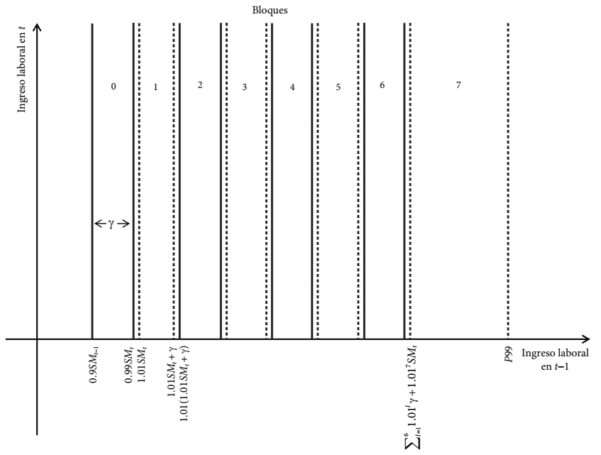 Para analizar el comportamiento del resto de la distribución del ingreso se segmenta esta última de manera similar a la descrita en la sección 4.2.2. El objetivo es comparar al grupo de potenciales beneficiarios del aumento del SM con las personas que reciben ingresos superiores al nuevo SM. El grupo de potenciales beneficiarios se identifica como bloque 0. El siguiente grupo de comparación equivale al representado en la Gráfica 3 y corresponde al bloque 1. Para el resto de la distribución se utiliza una división similar generando bloques de longitud uniforme γ, salvo el bloque 7 que incluye las observaciones restantes hasta el percentil 99. La Gráfica 4 muestra los segmentos definidos.3