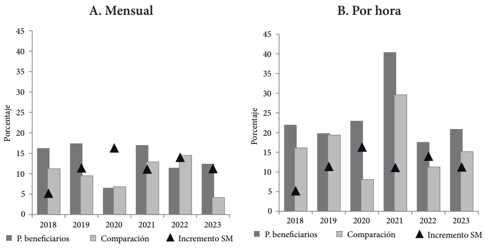 La sección A presenta la información para el ingreso mensual y la B la del ingreso por hora. En el panel A se observa que, en 2018 -después del incremento del SM-, el ingreso mensual de los potenciales beneficiarios creció en 16%, mientras que el grupo de comparación aumentó un 11%, lo anterior representa una diferencia de 5 puntos porcentuales (pp) entre ambos grupos. Este patrón se repite en los paneles de 2019, 2021 y 2023 con diferencias entre 4 y 8.2 pp. En 2020, los grupos experimentaron similar crecimiento en el ingreso mensual y en 2022 el grupo de comparación mostró un mayor incremento con una diferencia de 3 pp.