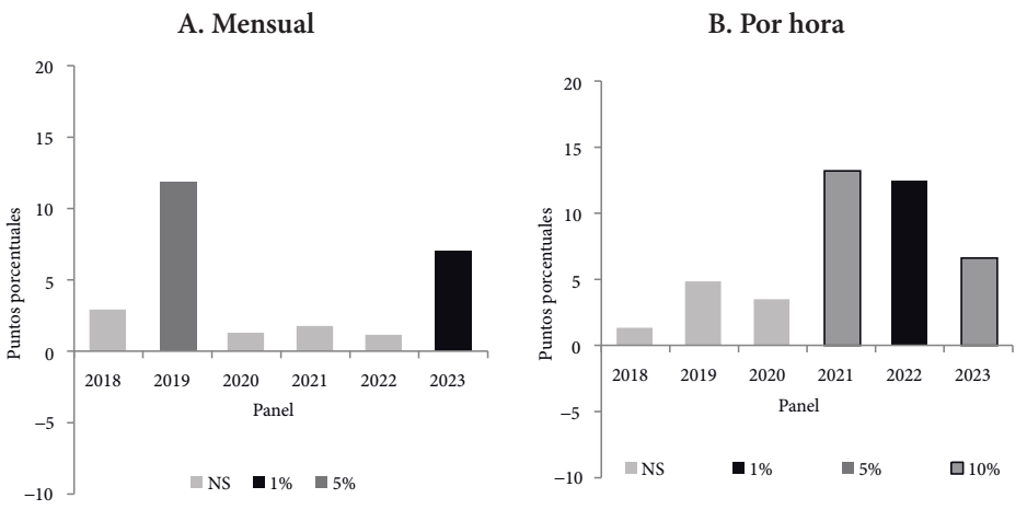 Con el objetivo de validar la hipótesis H1 y considerar otros factores que podrían influir en el crecimiento del ingreso laboral, la Gráfica 6 muestra la estimación del coeficiente (2 de la ecuación [1] para cada panel t.4 La sección A presenta el impacto del aumento del SM sobre el ingreso mensual, la altura de las barras indica la magnitud del coeficiente y el color su significancia. En 2018, 2020, 2021 y 2022 no se encontró evidencia de efecto estadísticamente significativo en el ingreso mensual entre los grupos analizados. Esto indica que el ingreso en ambos grupos creció, desde una perspectiva estadística, en la misma magnitud.