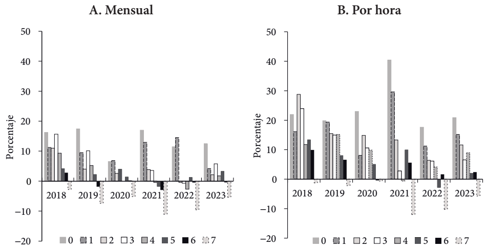 En la sección B de la Gráfica 5 se muestra que el ingreso por hora creció más en el grupo de potenciales beneficiarios, con diferencias entre 0.4 y 15 pp relativo al grupo de comparación. De la gráfica se destacan tres aspectos principales. Primero, tanto el ingreso mensual como el ingreso por hora aumentaron después del incremento del SM para ambos grupos. Segundo, aunque el ingreso mensual creció menos que el ingreso por hora, en la mayoría de los casos superó el aumento del SM. Por último, el crecimiento fue mayor en el grupo de potenciales beneficiarios, lo que da indicios de que el incremento del SM afectó principalmente a las personas con ingresos bajos.