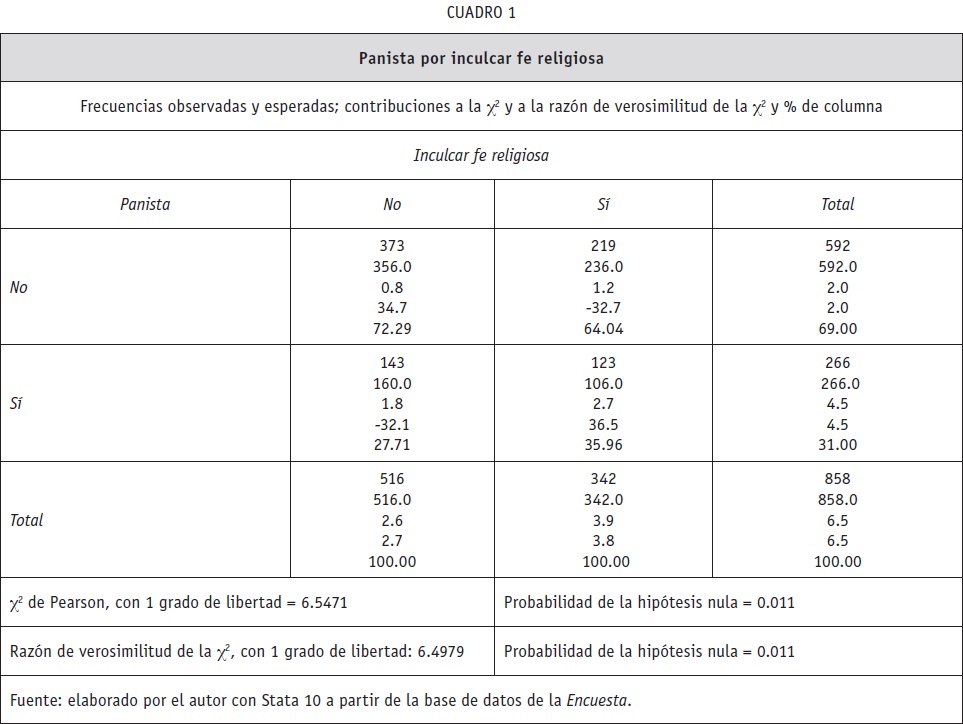 En una primera aproximación a la religiosidad de los panistas, usando dos variables nominales binarias, el cuadro 1 muestra que existe una alta asociación entre inculcar religión y ser simpatizante del pan a secas, lo que llamo identificación partidaria absoluta. La cantidad en negritas, 36.5, resume esta asociación. No siendo la x2 de cualquier cuadro una medida adecuada de la asociación entre variables, inserté en cada célula su contribución a la x2 total y su razón de verosimilitud. En la célula 4 (panistas que inculcan religión a sus hijos), se observan 3 datos significativos: la frecuencia observada es mayor que la esperada y sus contribuciones a la x2 total y a su razón de verosimilitud son positivas. En particular, su contribución a la razón de verosimilitud de la x2 del cuadro es la mayor de esas contribuciones.