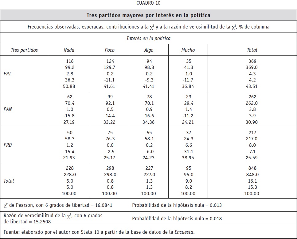 Sucede lo mismo tratándose de la identificación partidaria relativa de los panistas con Interés en la política. El cuadro 10 contiene dos tipos de datos, contradictorios a primera vista. Por un lado, la probabilidad de la hipótesis nula es muy baja, tanto la de x2 como la de su razón de verosimilitud (0.013 y, 0.018 respectivamente) o, en porcentajes, 1.3 y 1.8, respectivamente. Por otro lado, en el caso del PAN, las razones de verosimilitud de la x2 de "Poco" y "Algo" de interés en la política son positivas y las más altas de las columnas respectivas (14.4 y 16.6), mientras que las cantidades correspondientes en "Nada" y "Mucho" son negativas (-15.8 y -11.2). Esas cuatro cifras aparecen en negritas en el cuadro. Estos datos sugieren que el interés político de los simpatizantes del PAN se sitúa entre los dos extremos del desinterés o del interés totales. El PAN sería, así, por lo menos en sus simpatizantes, un partido en el centro del interés político.