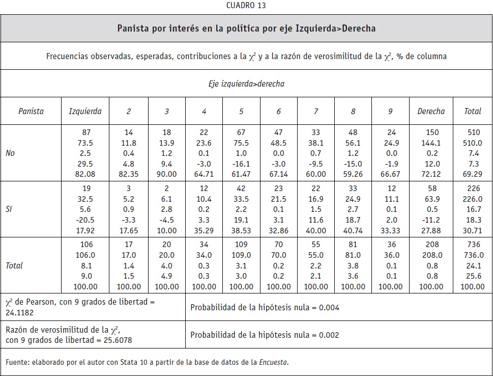 El cuadro 13 muestra que existe una alta asociación entre la autoubicación de las personas sobre el eje izquierda>derecha e identificación partidaria absoluta con el PAN. La probabilidad de la hipótesis nula del cuadro, medida con la x2 y con su razón de verosimilitud, es casi cero (0.004 y 0.002, respectivamente), con lo cual tenemos que aceptar la hipótesis alternativa de que existe esa asociación. Entrando en el detalle de las células, de las cantidades en negritas, la más alta (19.1) es la que indica la asociación entre el centro exacto de la escala (5) y la identificación partidaria panista absoluta., resume esta asociación. La segunda de esas cifras (18.7) sitúa a los simpatizante del PAN en el punto 8 de la escala, que podemos suponer que significa que esas personas se auto-ubican a la derecha. Las tres primeras cifras negativas, en cursiva, indican que los panistas no se identifican como de izquierda (-20.5, -3.3 y -4.5), mientras que la cuarta de ellas (-11.2) muestra que tampoco se auto-ubican a la extrema derecha de la escala. De manera resumida, todos estos datos sugieren que las contribuciones mayores a la razón de verosimilitud de la x2 del cuadro son las del rechazo a la izquierda, la ubicación en el centro y en los puntos no extremos de la derecha, así como el rechazo a la extrema derecha.