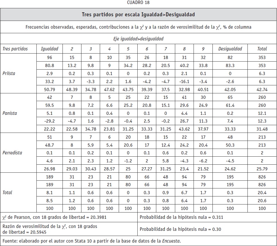 El cuadro 17 muestra que existe asociación entre autoubicación de las personas sobre el eje igualdad>desigualdad e identificación partidaria absoluta con el PAN. La probabilidad de la hipótesis nula del cuadro, medida con la x2 y con su razón de verosimilitud, es menor a 0.05 (0.039 y, 0.036, respectivamente), con lo cual aceptamos, con un Nivel de Confianza de 95%, la hipótesis alternativa de que existe esa asociación. Entrando en el detalle de las células, las tres cantidades en negritas, que son positivas, (26.7, 11.3 y 7.4), indican la asociación entre el extremo derecho del eje y la identificación partidaria panista absoluta. Además, las tres primeras cifras negativas, en cursiva (-29.2, -4.7 y 1.6) indican que los panistas se identifican negativamente con la igualdad. De manera resumida, todos estos datos demuestran que el Partido (de) Acción Nacional es un partido antiigualitario.