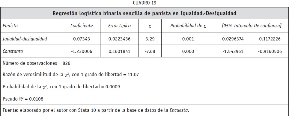 El cuadro 19 muestra la inluencia de la auto-ubicación de las personas en el eje igualdad>desigualdad en identificación partidaria absoluta panista.