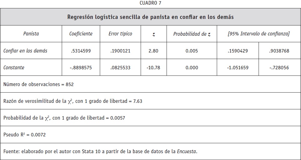 El cuadro 7 muestra, con los logaritmos de la razón de las probabilidades, el coeficiente de regresión logística binaria sencilla de identificación partidaria absoluta panista en confiar en los demás.