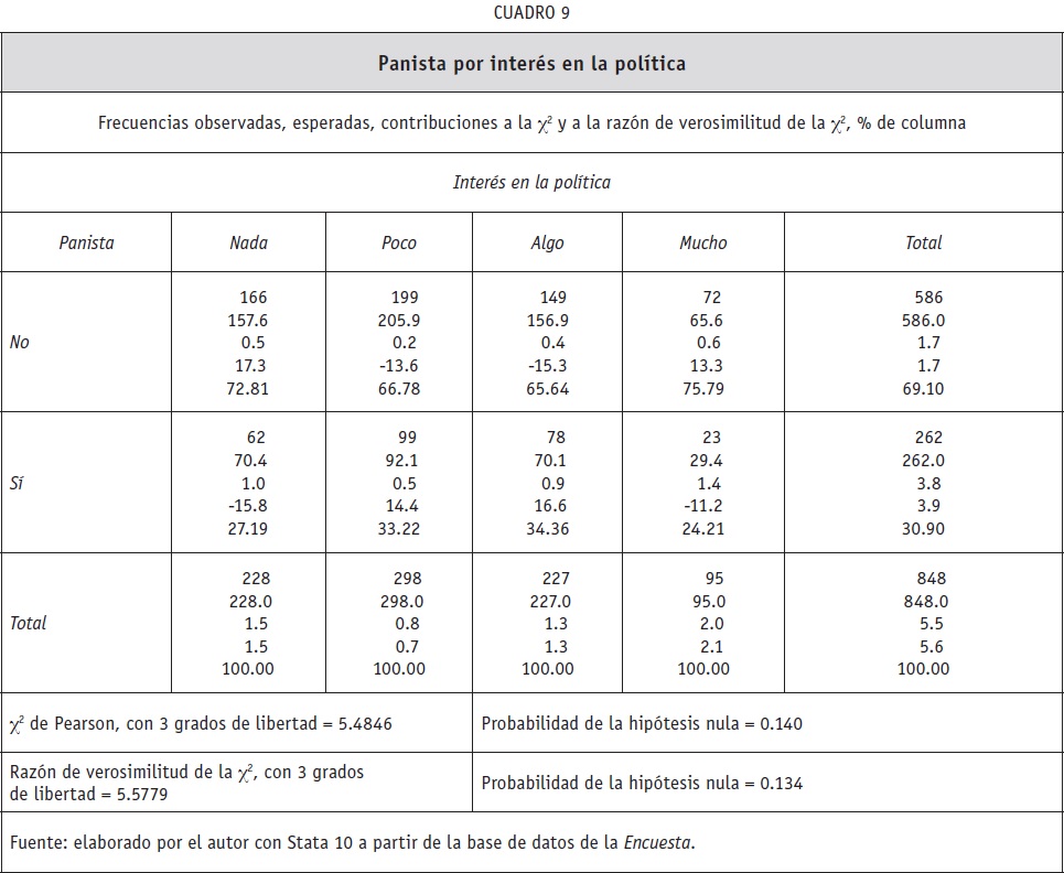 Como lo hice con los dos primeros valores, empezaré el análisis sobre el interés en la política de los panistas con la técnica más sencilla, el análisis tabular. A diferencia de los cuadros 1 y 5, el nueve no muestra que haya asociación alguna entre sentirse panista e interés en la política. La probabilidad de la hipótesis nula es muy alta, tanto de la x2 como de su razón de verosimilitud (0.140 y 0.134, respectivamente). En términos porcentuales, existe alrededor de 13 por ciento de que no exista esa asociación.